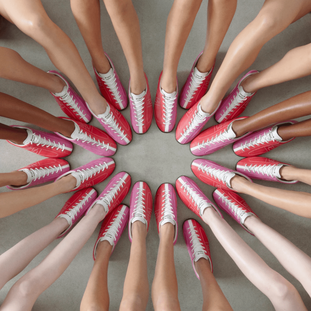Un modelo con una clara estética vintage que evoca los zapatos de bolera, con un diseño bicolor que simboliza a la perfección la sintonía creativa entre ambas marcas. La campaña, fotografiada por Dan Tobin Smith, escenifica mandalas humanos en un cruce entre arte visual y performance.
