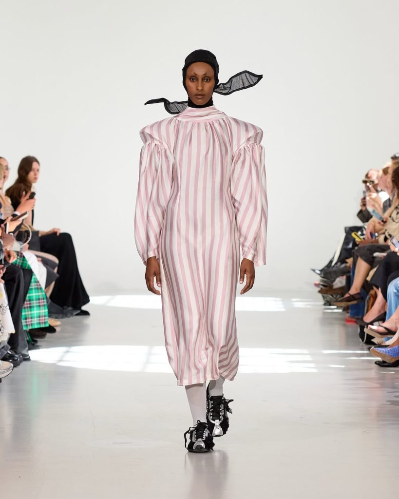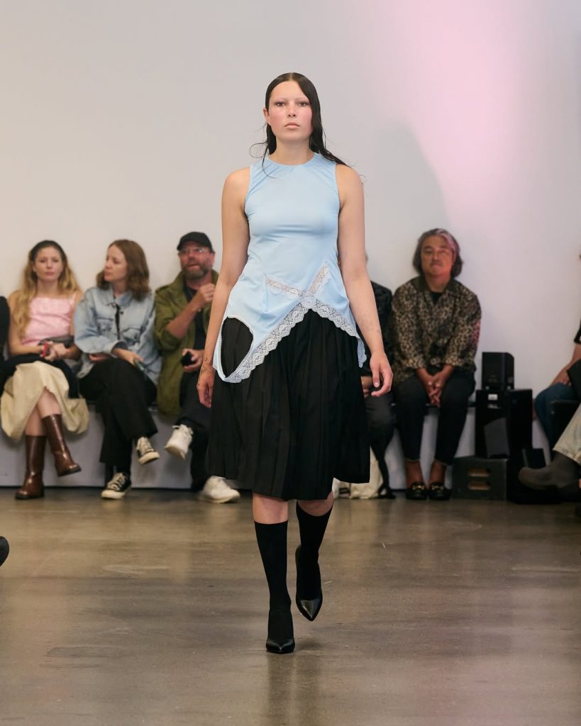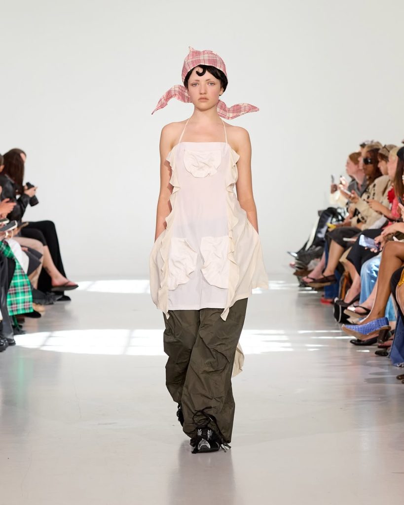 En los pies, las modelos llevan zapatillas Puma decoradas con lazos, mientras que algunas faldas incorporan armazones visibles, reforzando la idea de transparencia en el proceso de creación. Los hombros, a veces con grandes hombreras y otras veces caídos, apuestan por mostrar el reverso del escenario. Un vestuario poético, crudo y sin complejos.
