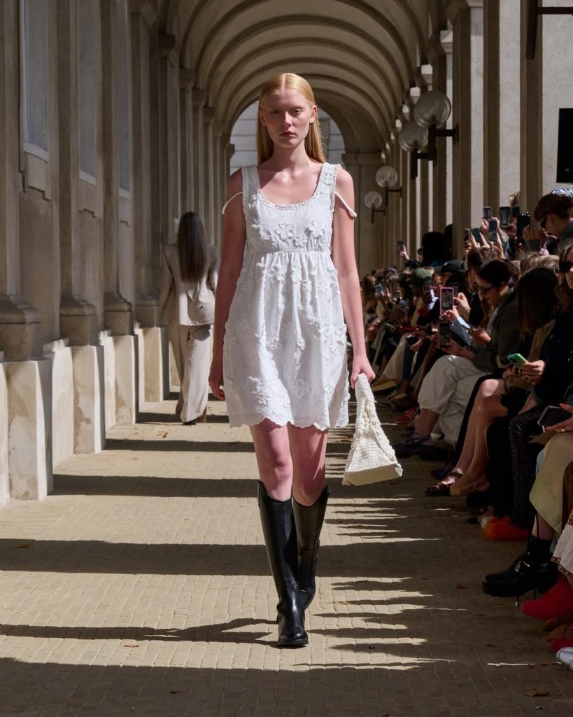 Los diseños de esta marca están protagonizados por la fluidez, con 33 siluetas de líneas depuradas en tonos neutros salpicadas con toques de rojo. El vestuario campestre, con vestidos con volantes y pañuelos anudados en la cabeza o en la cintura, se convierte poco a poco en una propuesta más urbana y oscura, donde el tejido denim fluido se une a grandes bolsos de polipiel.