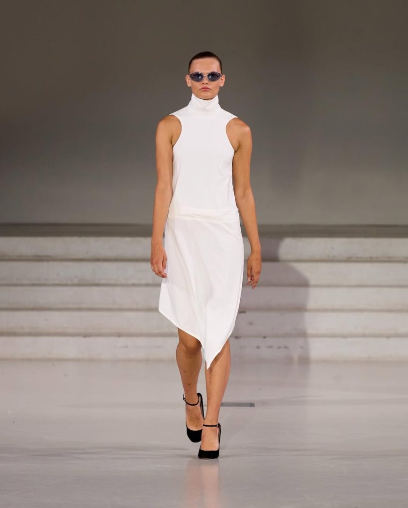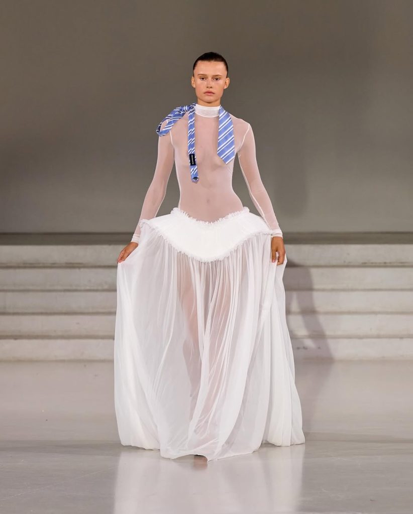 Esta colección apuesta por la personalización. Entre los 30 looks presentados, algunos destacan por un corte cuadrado que difumina la mirada. Otros, por su estética años 90: cuello alto estilo camiseta de tirantes y gafas ovaladas de cristales ahumados. Los detalles textiles, especialmente en vestidos y tops, recuerdan las asperezas de una concha, reforzando el aspecto líquido del conjunto. El final lo confirma: un vestido en parte transparente, estructurado al estilo tutu, acentúa las caderas como una medusa en movimiento.