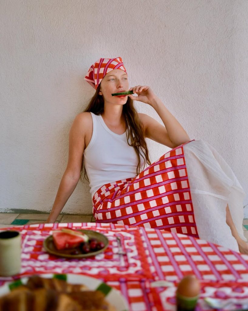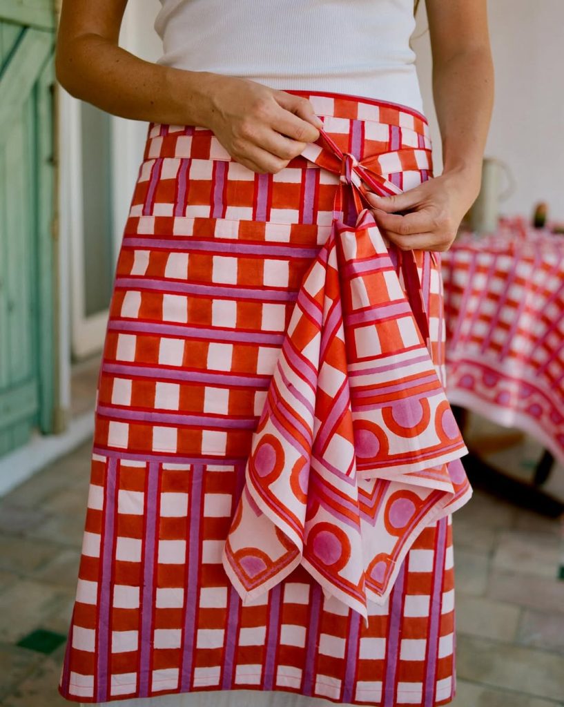 En cambio, en las redes sociales, aunque va ganando terreno, la tendencia sigue siendo discreta. Está presente sobre todo en perfiles de creadoras o artesanas que conservan su delantal para hacerse una foto, ya no como protección, sino como auténtico signo de identidad. Es el caso de la chef Alice Moireau o de Candice Margaux Hauss, fundadora del Studio Haust, que convierte uno de sus manteles en delantal. Un gesto simple pero muy simbólico que deja huella.