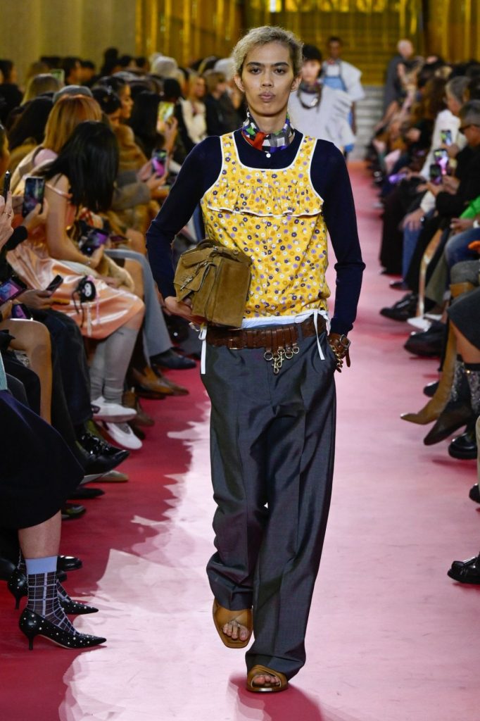 Miuccia Prada, fiel a su gusto por las paradojas, no quiere glorificar a las amas de casa (para desgracia de la tendencia Mob wife). Más bien al contrario: extrapola estas prendas de su marco doméstico y las hace desfilar sobre la pasarela. Este gesto, a la vez conceptual y político, rinde homenaje a las mujeres que las llevaron por necesidad, estableciendo al mismo tiempo una nueva forma de reivindicación femenina. Además, las mesas de formica de colores que sirven de asientos para los invitados refuerzan el paralelismo entre un interior doméstico y la estética del desfile.