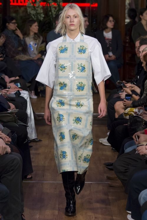 Pero el regreso del delantal y de la bata no se limita al imaginario de Miuccia Prada. Antes de la Fashion week de París, otras marcas ya habían reactualizado estas prendas prácticas. Por ejemplo, en la marca londinense Ashley Williams, adoptan un aire pop y girly, combinadas con otros elementos del vestuario «de la mujer mayor», como los zapatos ortopédicos.