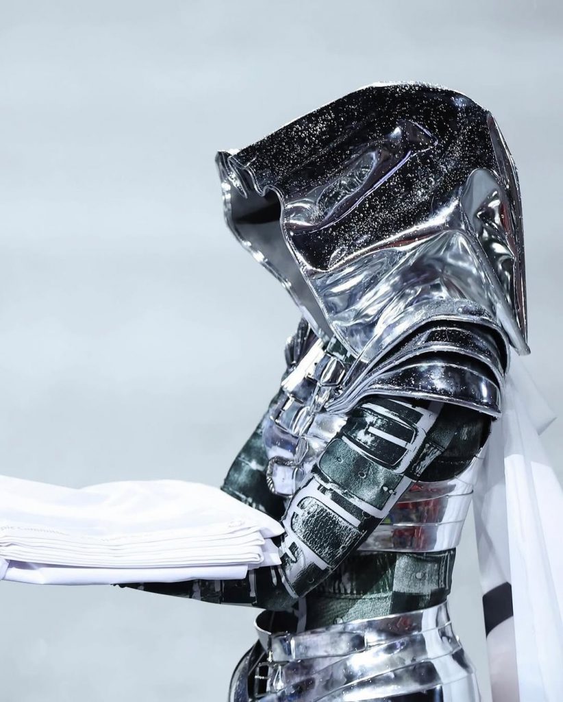 La armadura es, por supuesto, su sello distintivo. Una pieza especial presente en cada una de sus colecciones, ya que refleja la lucha por una mayor inclusión. En forma de botas altas adornadas con hebillas de cinturón, o en camisetas con mensajes contundentes como “A woman is somebody, not some body” (“Una mujer es alguien, no solo un cuerpo”), lucida por uno de sus modelos que vestía además falda corta y botas blancas. En otra de sus camisetas se podía leer la inscripción “Visions” en contraste, con unos ojos con ojeras rojas o con lentillas negras.