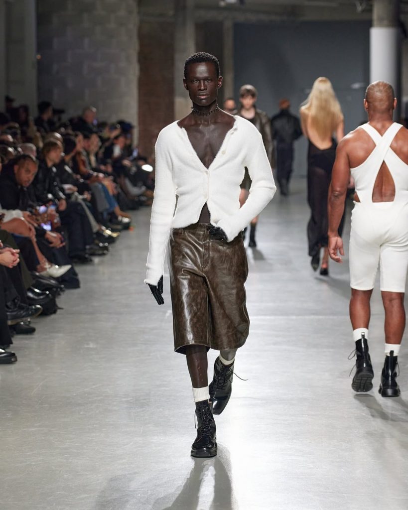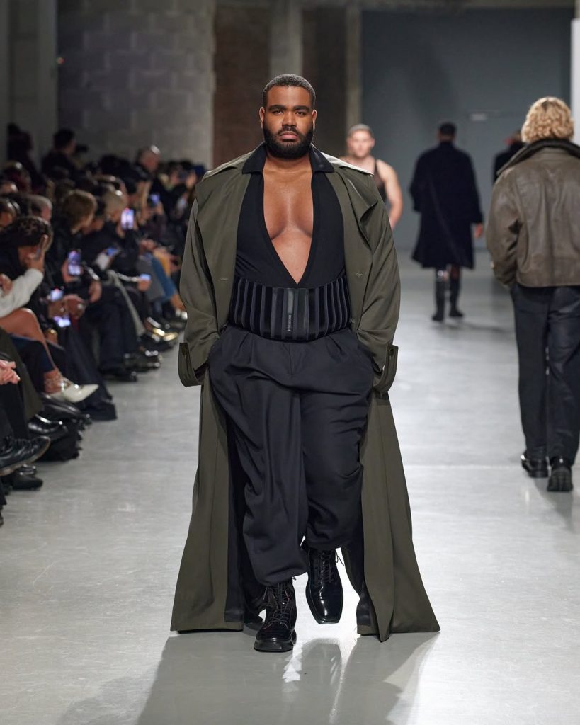 ¿Cuál es su punto fuerte? Un tailoring riguroso combinado con drapeados suaves, transparencias propias de la lencería y cortes que se inspiran en los vestidos, revelando una masculinidad diversa y plural. Los cuerpos se exponen con audacia, muy a menudo vestidos de negro, un color que el diseñador reivindica como su sello distintivo.