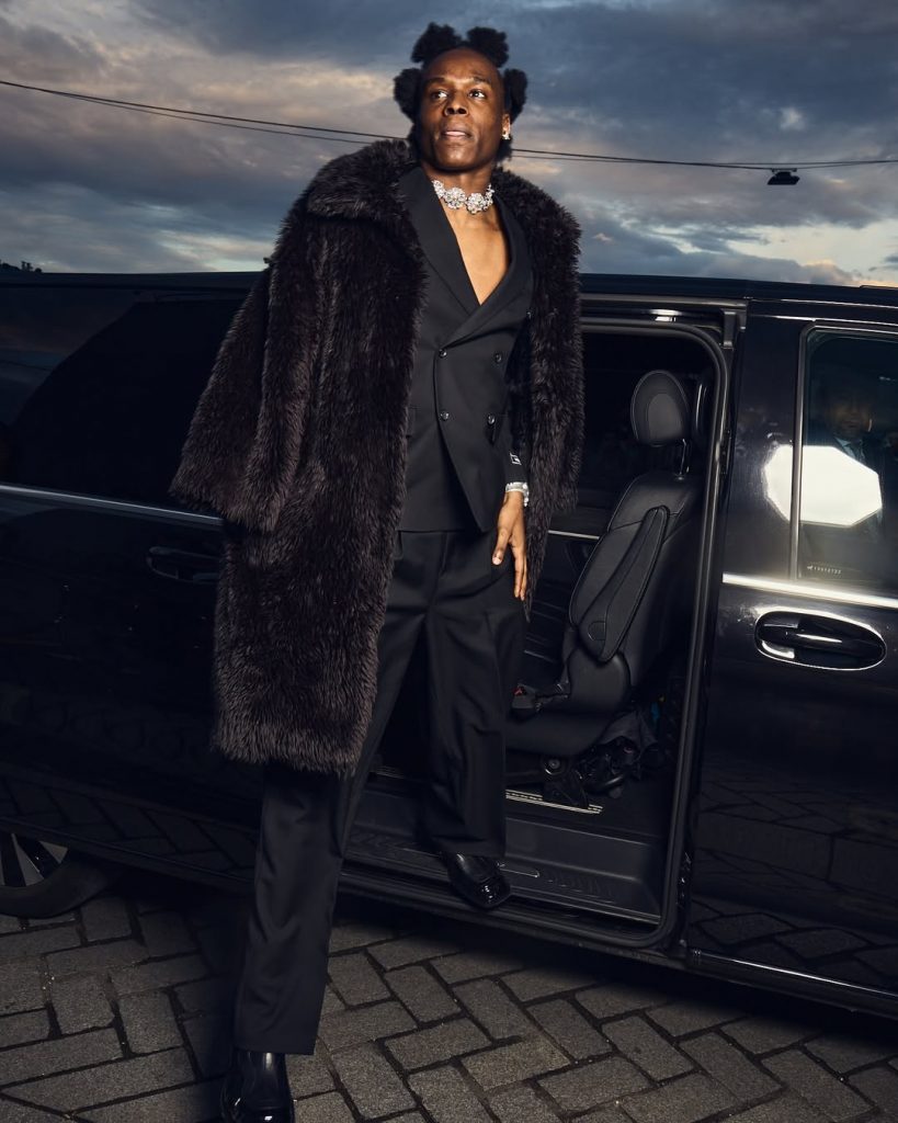 Jolagreen23 apostó por un traje cruzado negro combinado con mocasines de punta cuadrada, todo ello unido a un abrigo de piel XXL digno de los videoclips de los años 90. Joe Dwet Filé, galardonado con la Flamme a la mejor canción con resonancias caribeñas, también eligió un traje ajustado con detalles satinados.