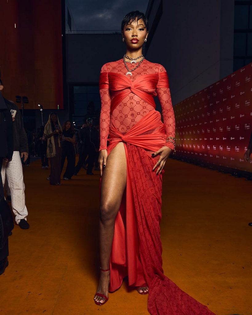 Shay, nominada como artista femenina del año y fiel a Balenciaga, desfiló por la alfombra roja vestida de negro, con un vestido enlazado en la espalda de la colección Primavera-Verano 25, ropa interior visible y un bolso sin adornos. Una elección minimalista e incisiva, sello distintivo de la rapera de Bruselas.