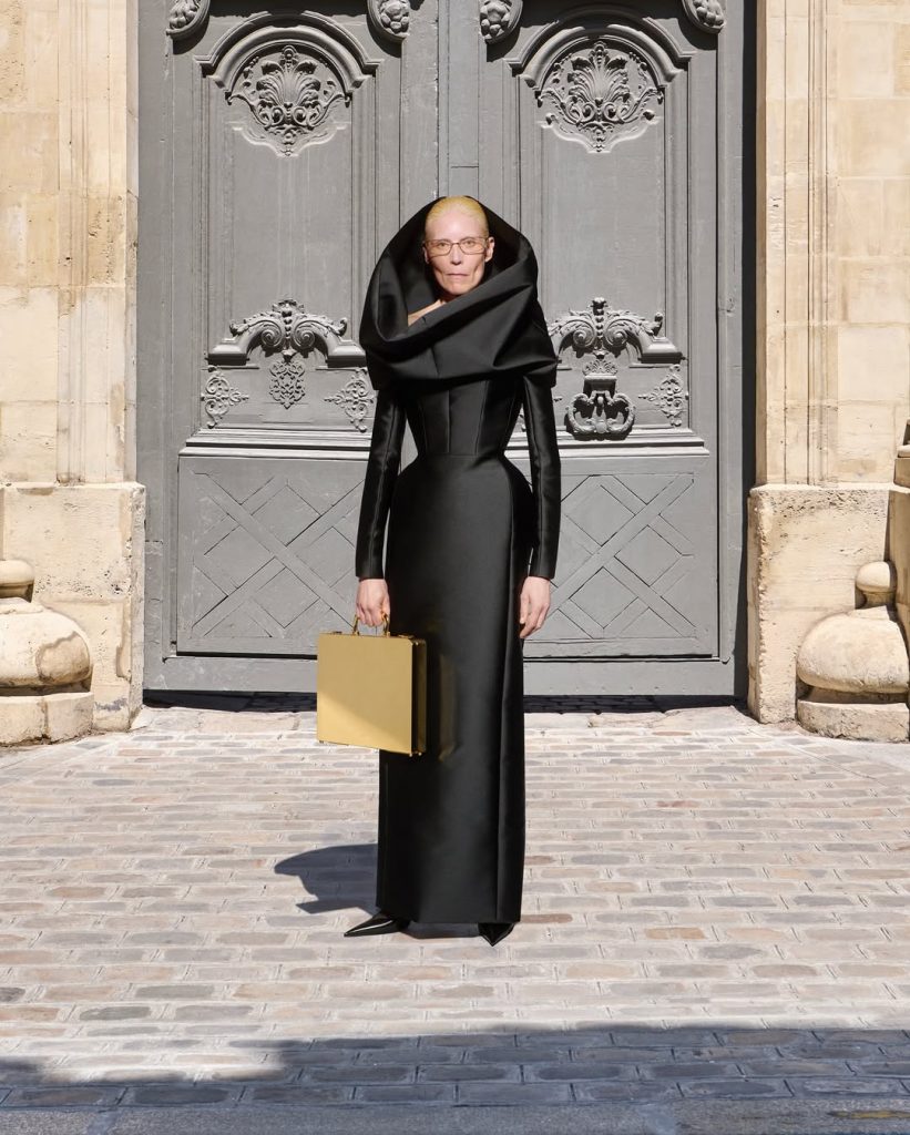 Para su última colección de alta costura, Demna ha vuelto a hacer uno de sus ejercicios favoritos: crear un teatro de personajes. En la intimidad de los salones históricos de la marca, el diseñador convocó a toda una serie de figuras cinematográficas: estrellas de Hollywood, hombres de negocios anónimos, agentes de seguridad.
