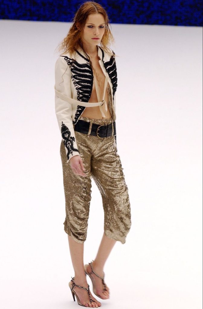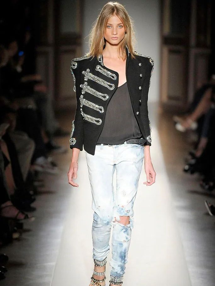 Más tarde, a principios de los años 2000, la chaqueta con hombreras y galones volvió a ser la protagonista. En el desfile primavera-verano 2003 de Alexander McQueen las siluetas dudaban entre ser pirata u oficial, como si hubieran surgido de la espuma del mar… o de un after. Por su parte, y del otro lado de la Mancha, Balmain adoptó a su vez esta pieza icónica bajo la dirección de Christophe Decarnin, que inyectó a la marca una energía rock y profundamente contemporánea.
