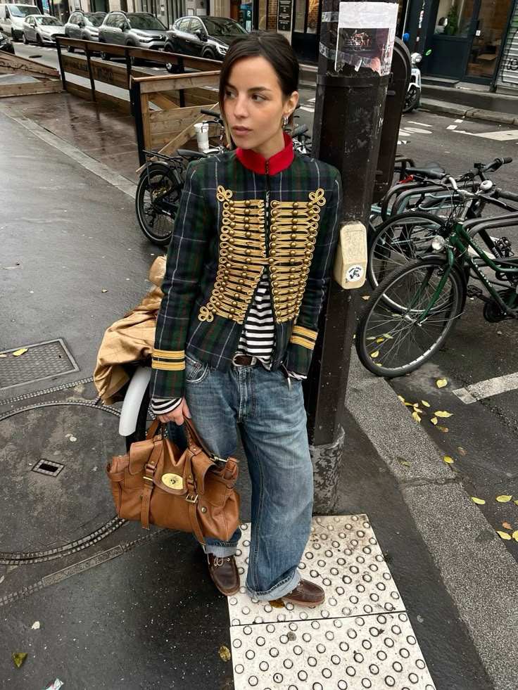 Esta prenda icónica que creímos redescubrir bajo el nombre de “chaqueta de oficial” es, en realidad, una chaqueta de húsares, o más precisamente un dolman: una chaqueta corta con muchos adornos e inspirada en el uniforme de ceremonia de los oficiales. Decorada con trenzas doradas o plateadas, luce ese aire prestigioso propio del uniforme militar.