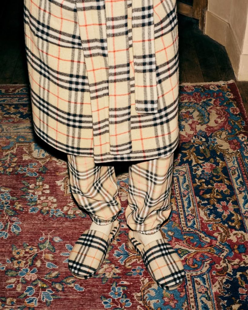 Los accesorios y las piezas más icónicas de Burberry se integran de manera natural en la puesta en escena: bufandas de cachemira, los legendarios trench coats y detalles con cuadros escoceses que crean una atmósfera muy especial.