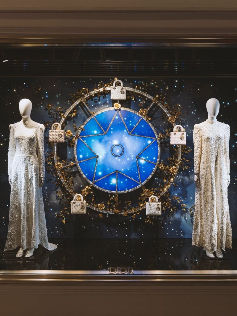 No muy lejos de allí, la selecta Avenue Montaigne se ilumina gracias a Dior. La marca inauguró las festividades el 17 de noviembre en su histórica tienda, donde los escaparates reflejan una nueva etapa de la casa bajo la dirección artística de Jonathan Anderson, invitándonos a un paseo mágico por una de las avenidas más prestigiosas del mundo.