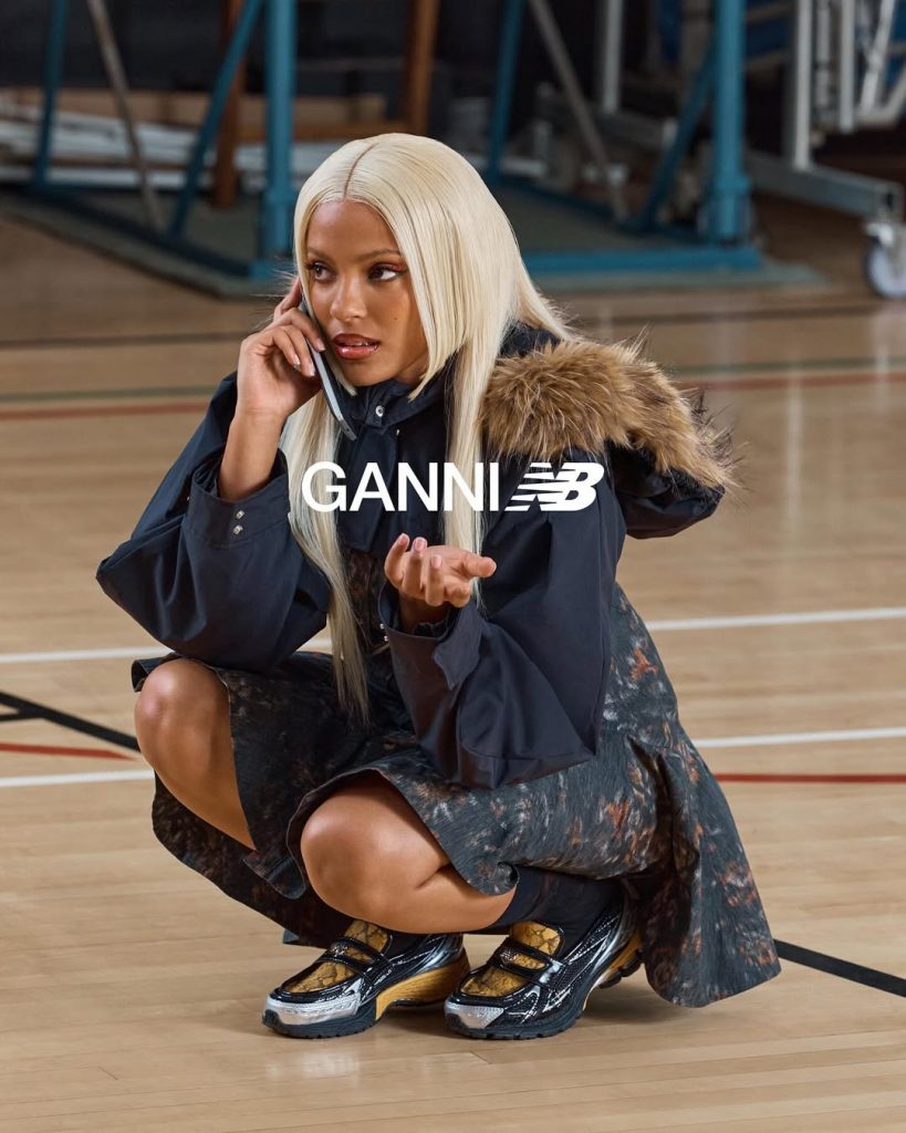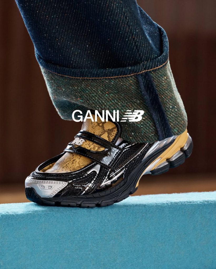 La firma danesa Ganni ha reinventado el modelo 1906L de New Balance en una versión maximalista. Este modelo híbrido se viste con un estampado de serpiente amarillo, motivo emblemático de la marca. Un detalle no pasa desapercibido: una joya en cada zapato como símbolo de esta colaboración.