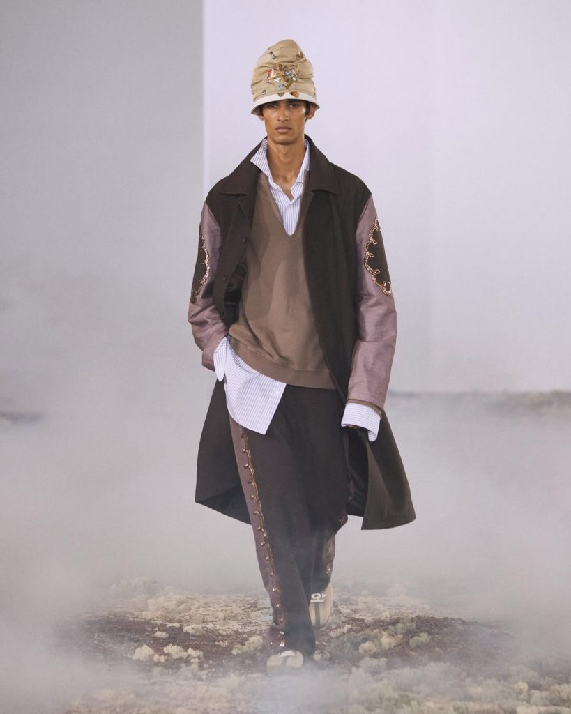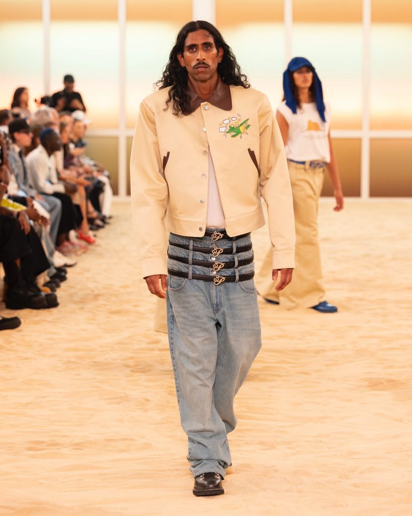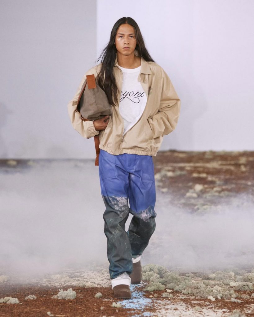 El vestuario de Blue Marble retoma prendas esenciales del estilo outdoor: denim oversize en varios tonos, impermeables XXL y bolsos llevados bajo el brazo. Los looks se complementan con sombreros extraños decorados con pines y accesorios turísticos reinterpretados, que migran progresivamente de la cabeza hacia el torso como una lluvia de recuerdos.