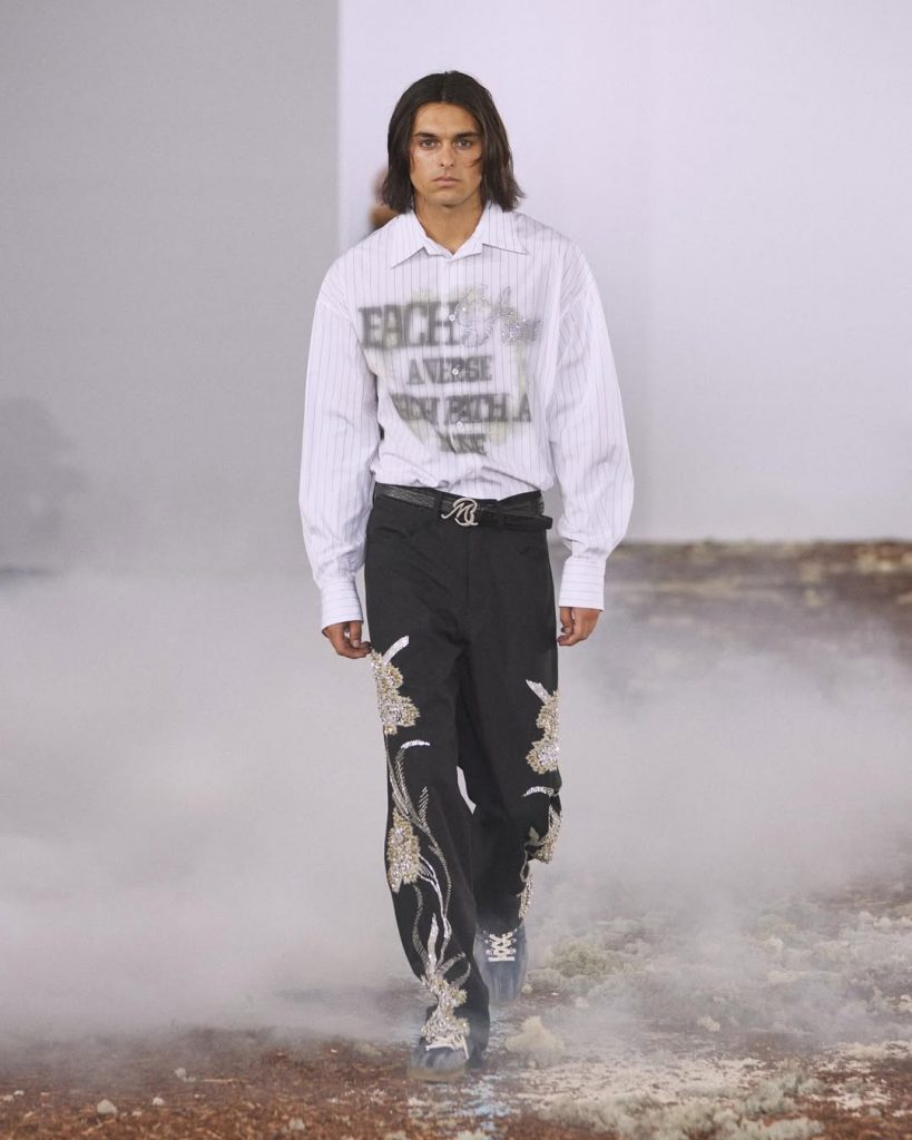 Algunas piezas parecen casi encriptadas, como si fueran mensajes ilegibles bordados sobre las prendas. Así, el destino no importa, lo importante es el camino. ¿Cuál es la pieza clave? Una camisa decorada con una guirnalda de flores como si fuera una huella poética del terreno conquistado. Un recuerdo visible del esfuerzo realizado.