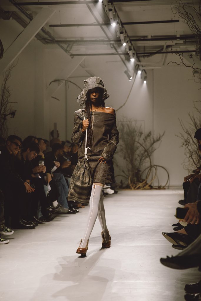Para este desfile, el diseñador ha elegido el bosque como punto de partida. Un espacio ambiguo que puede ser refugio y amenaza, donde la identidad puede expresarse libremente lejos de las convenciones sociales. En este escenario cargado de simbolismo, las sneakers amplifican ese sentimiento de ambivalencia. El diseñador reinterpreta la icónica Chuck Taylor All Star de Converse con texturas inesperadas y acabados singulares. Materiales encerados, tratamientos impermeables y un claro toque práctico que se integra perfectamente en la estética outdoor de la colección. Una sutil relectura que demuestra cómo un clásico puede integrarse en un estilo de moda mucho más conceptual.