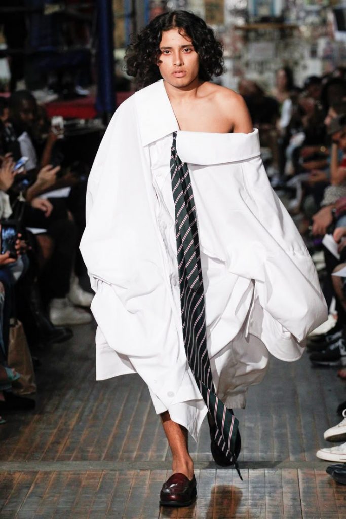 Liberada del corsé del convencionalismo, la corbata se democratiza gracias a la moda alternativa y al streetwear, apareciendo en looks informales junto a sudaderas con capucha, vaqueros, blazers oversize… El accesorio se convierte en un guiño, un statement que difumina las fronteras. Algunas marcas emergentes la han reinventado con humor o poesía: de crochet, de seda fluida, a veces incluso desestructurada, recosida o confeccionada con materiales increíbles. La corbata encarna así la idea de una moda unisex y hetereogénea libre de géneros y de convenciones.