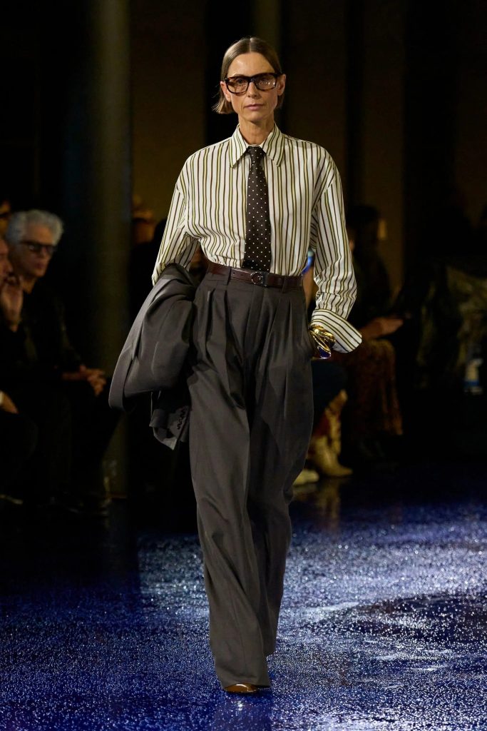 Hoy en día, la corbata regresa con fuerza gracias a la tendencia officewear, con la que, como de nuevo en Saint Laurent (otoño/invierno 2025), acompaña a trajes amplios, interpretando elementos del vestuario masculino sin perder elegancia. El traje de corbata se convierte en un símbolo de poder y estilo, llevado con la misma autoridad por hombres y mujeres.