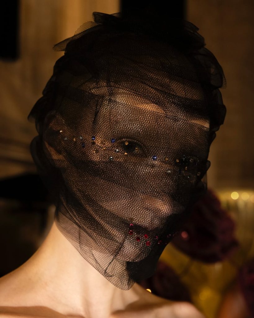 Finamente tejido o de tul transparente, este velo o redecilla hace su aparición en Rahul Mishra, que colabora en esta ocasión con el gran modista Stephen Jones, protagonista de una exposición en el Palais Galliera el año pasado. Este accesorio se posa delicadamente sobre el rostro, como un filtro vintage, y es ideal para una boda, una cena elegante o incluso un concierto. Opta por uno negro para un estilo sobrio, o uno en tonos pastel para un look romántico. Aportará un toque de misterio muy retro.