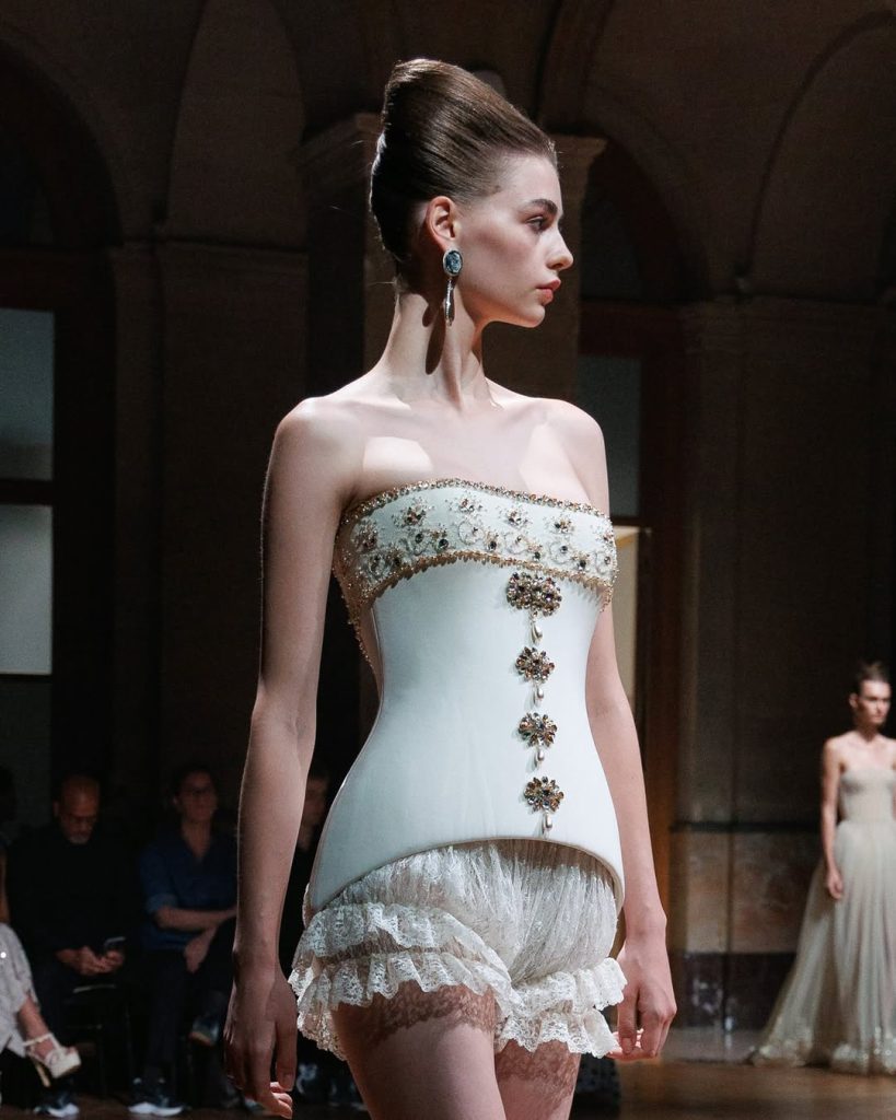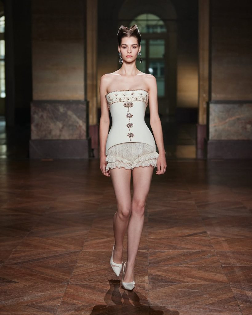 Para Georges Hobeika, la lencería es la protagonista indiscutible. Volantes de tul, encajes elaborados, talles altos … Una lencería para llevar en la intimidad, pero también, y sobre todo, en público, bajo un traje sastre oversize o combinada con una camiseta blanca minimalista. ¿Cuál es el objetivo? Sacar la ropa interior al exterior para darle una nueva vida, romper barreras y, sobre todo, vestirse según sus propias reglas. Por eso, la braguita ya no es solo una prenda interior, es una declaración de intenciones.