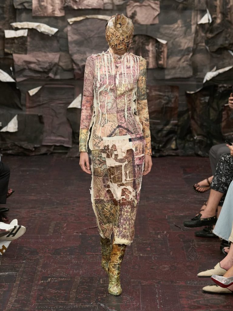 En Maison Margiela, Glenn Martens se apropia del patchwork, uniendo fragmentos textiles como si escribiera una historia. Las siluetas evocan tapices antiguos, recreando una especie de memoria recompuesta que no tiene nada que ver con el folklore: es toda una oda al reciclaje y al saber hacer artesanal. Una tendencia que se refleja en nuestra vida cotidiana con el regreso del DIY, vistiendo de nuevo unos jeans desgastados, mezclando estampados y combinando materiales nobles con reciclados.